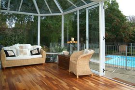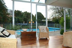 French doors off the conservatory leads to the in ground pool and another outdoor living area.