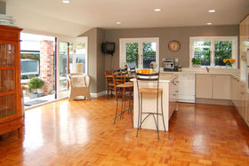 Kitchen/Dining – This is another large room with parquet flooring, great space for cooking and entertaining. French doors from the kitchen lead to a beautiful enclosed courtyard.