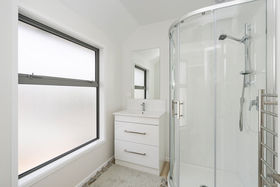 Beyond the light-filled staircase is the generous master bedroom with ensuite and robe, plus a further two double bedrooms with built-in robes and central bathroom.